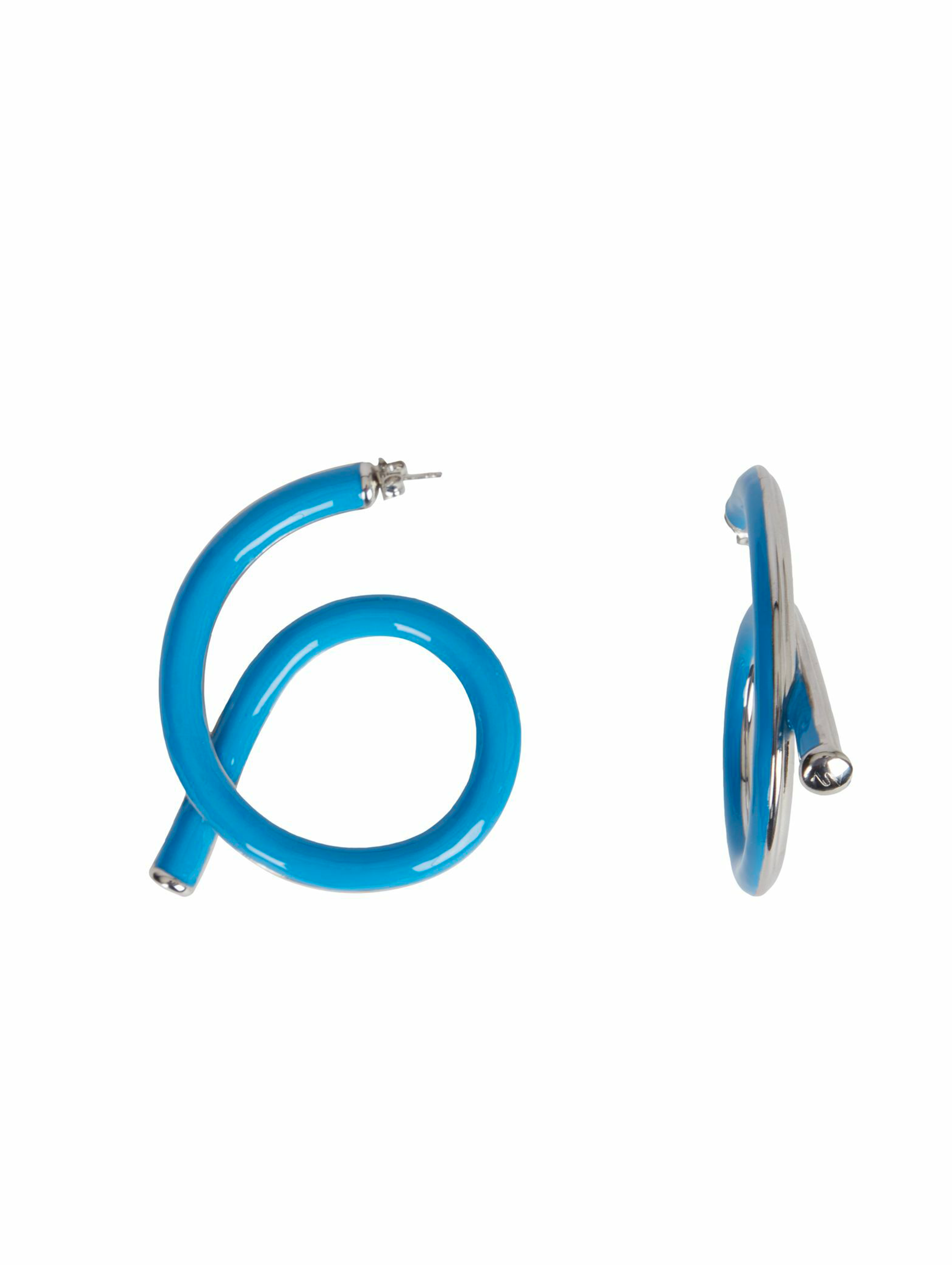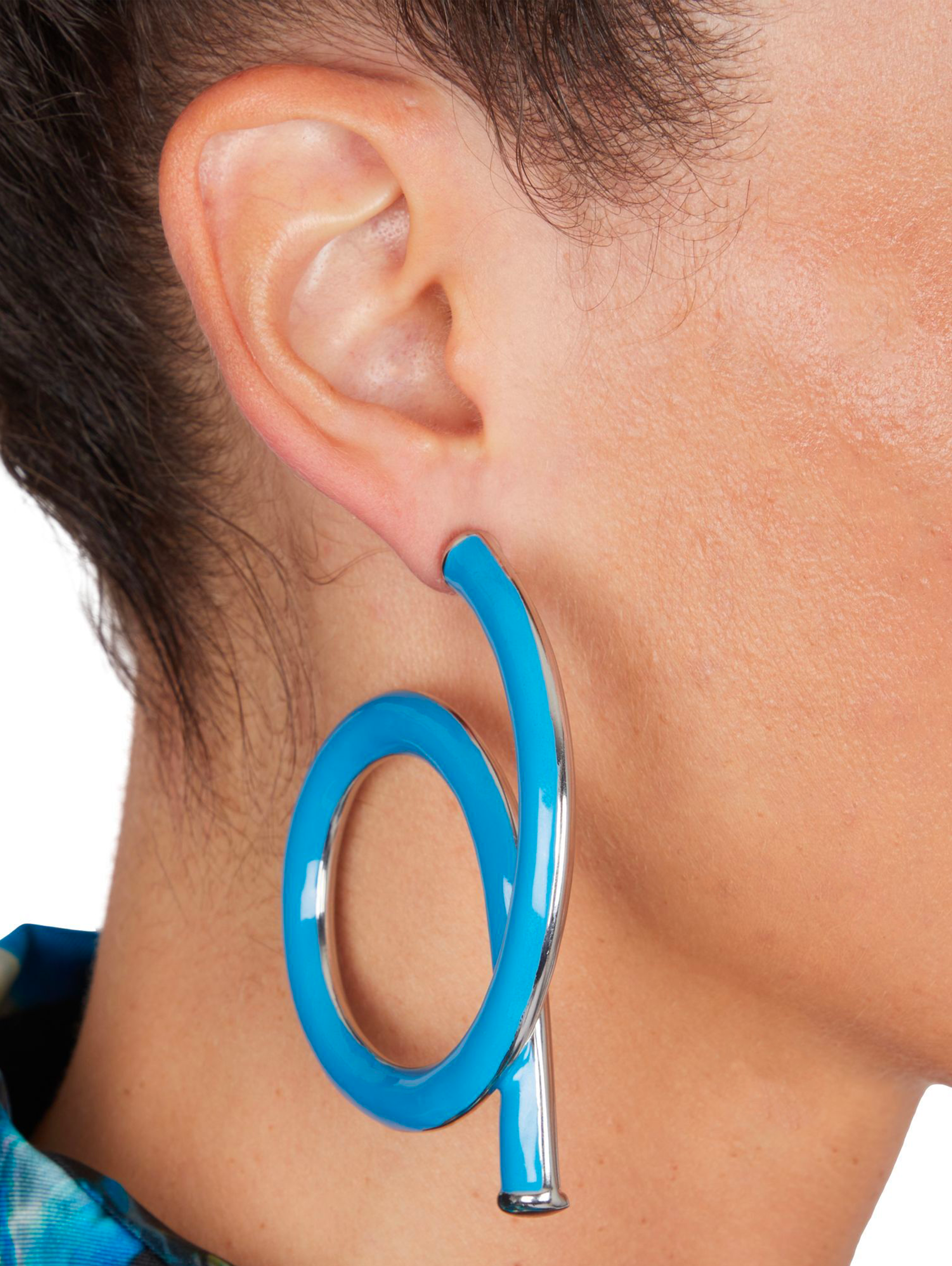 Cette version se distingue par un design double-face : une moitié est émaillée à la main d’un bleu azur, tandis que l’autre reste en argent poli, permettant de porter les boucles de deux manières différentes colorées et audacieuses d’un côté, pures et minimalistes de l’autre.
