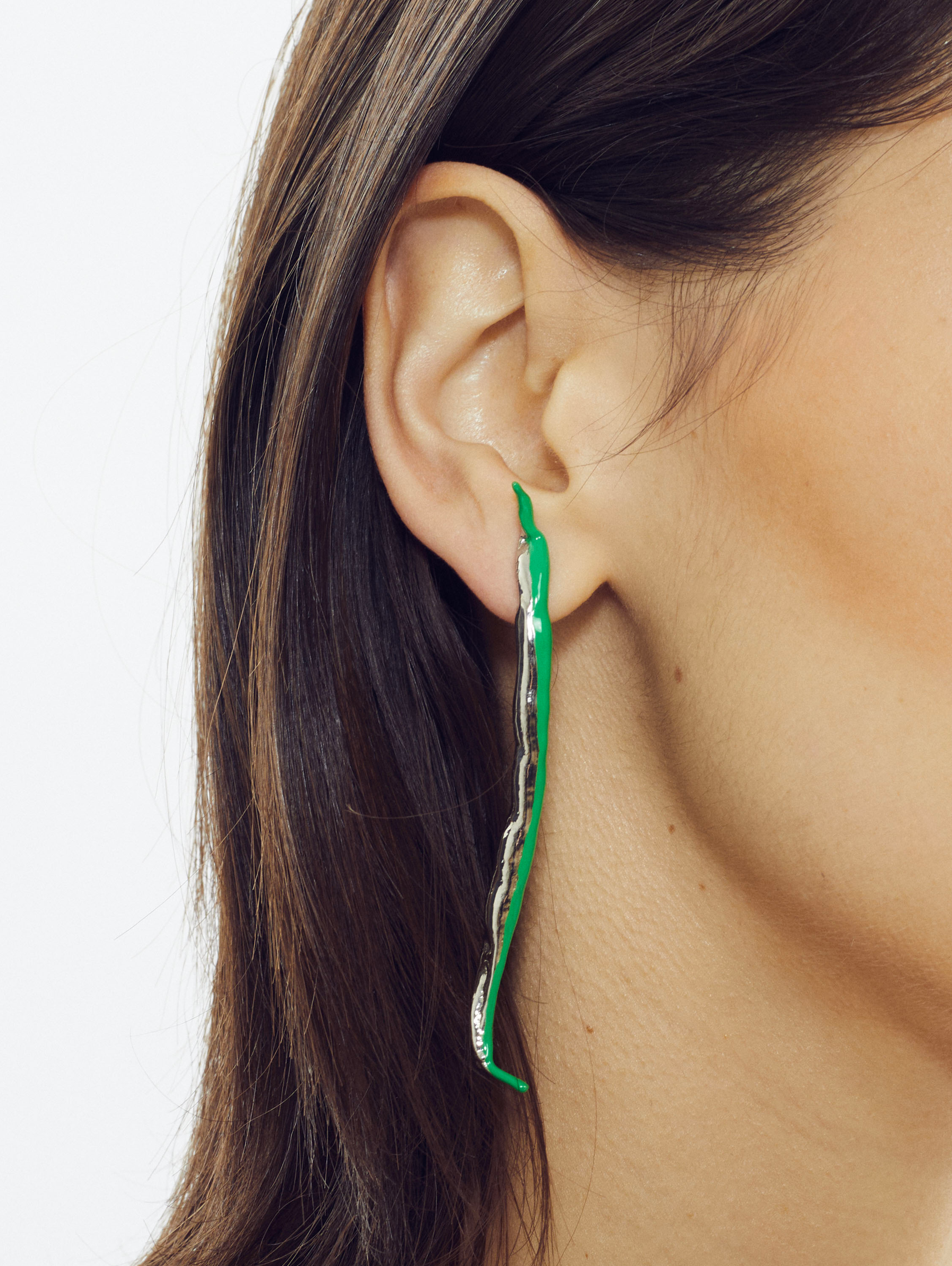 The Green Bean Earrings reinterpret organic forms through a surrealist lens, resembling small glossy green beans, hand-enameled with precision.