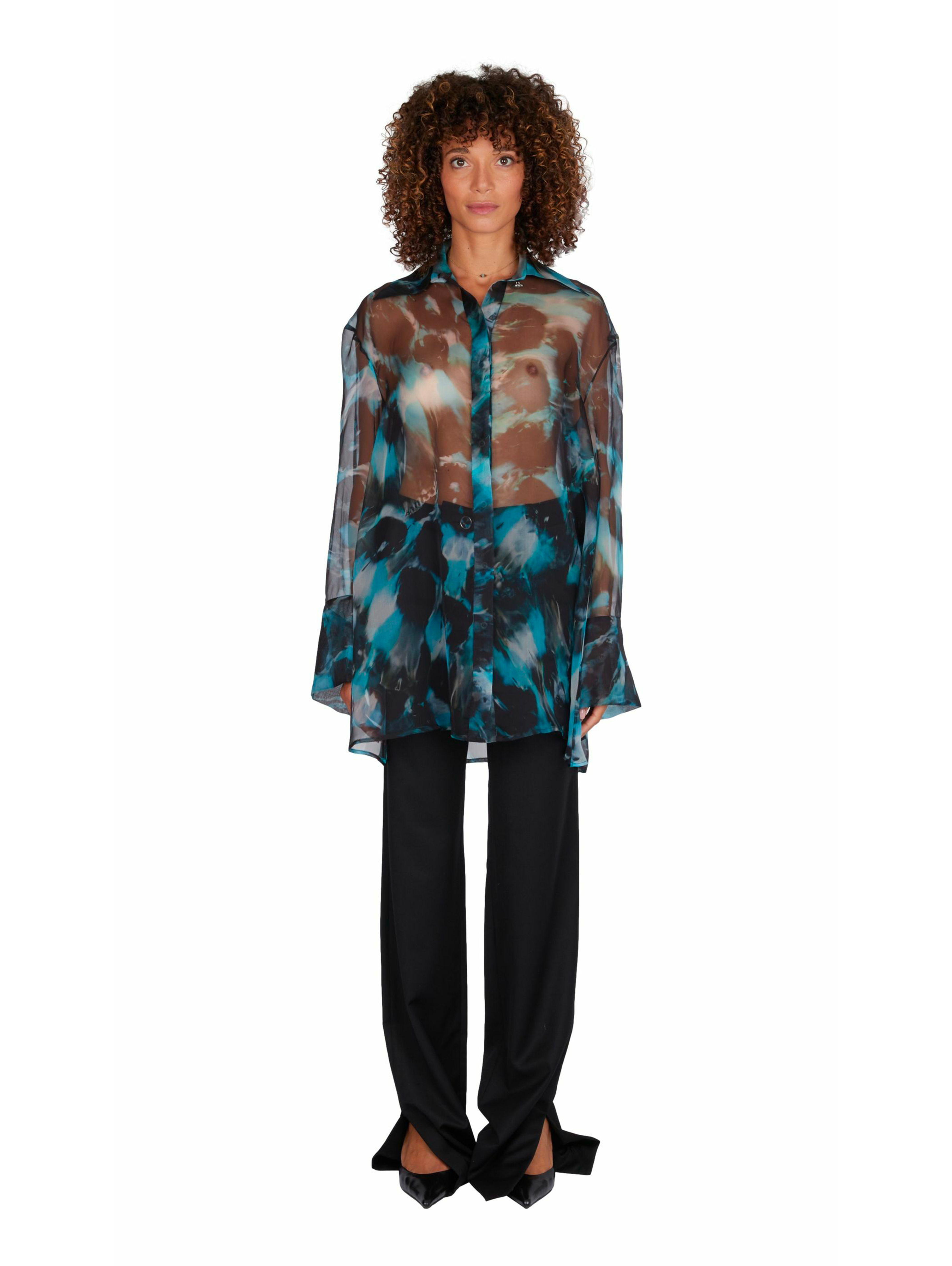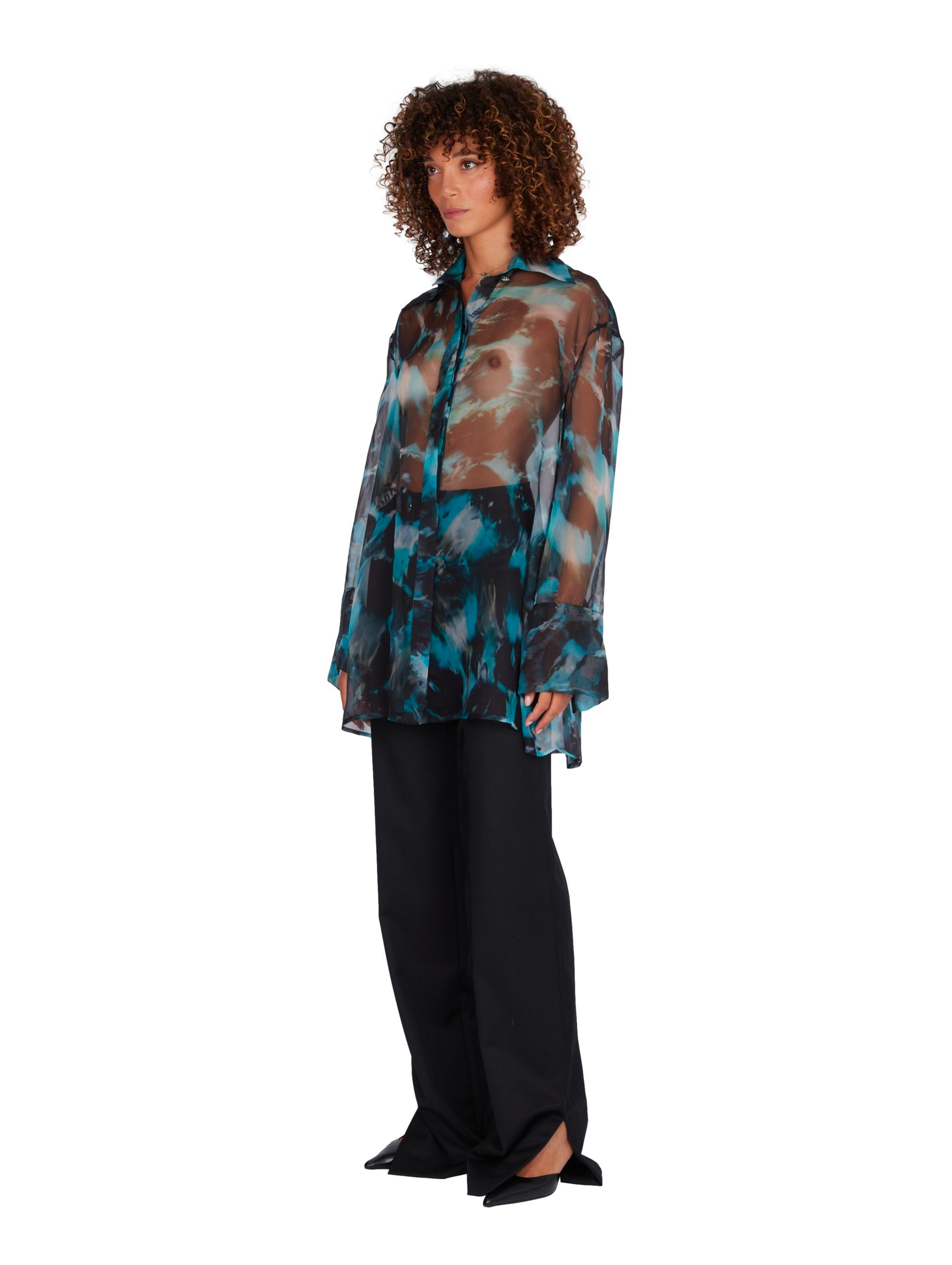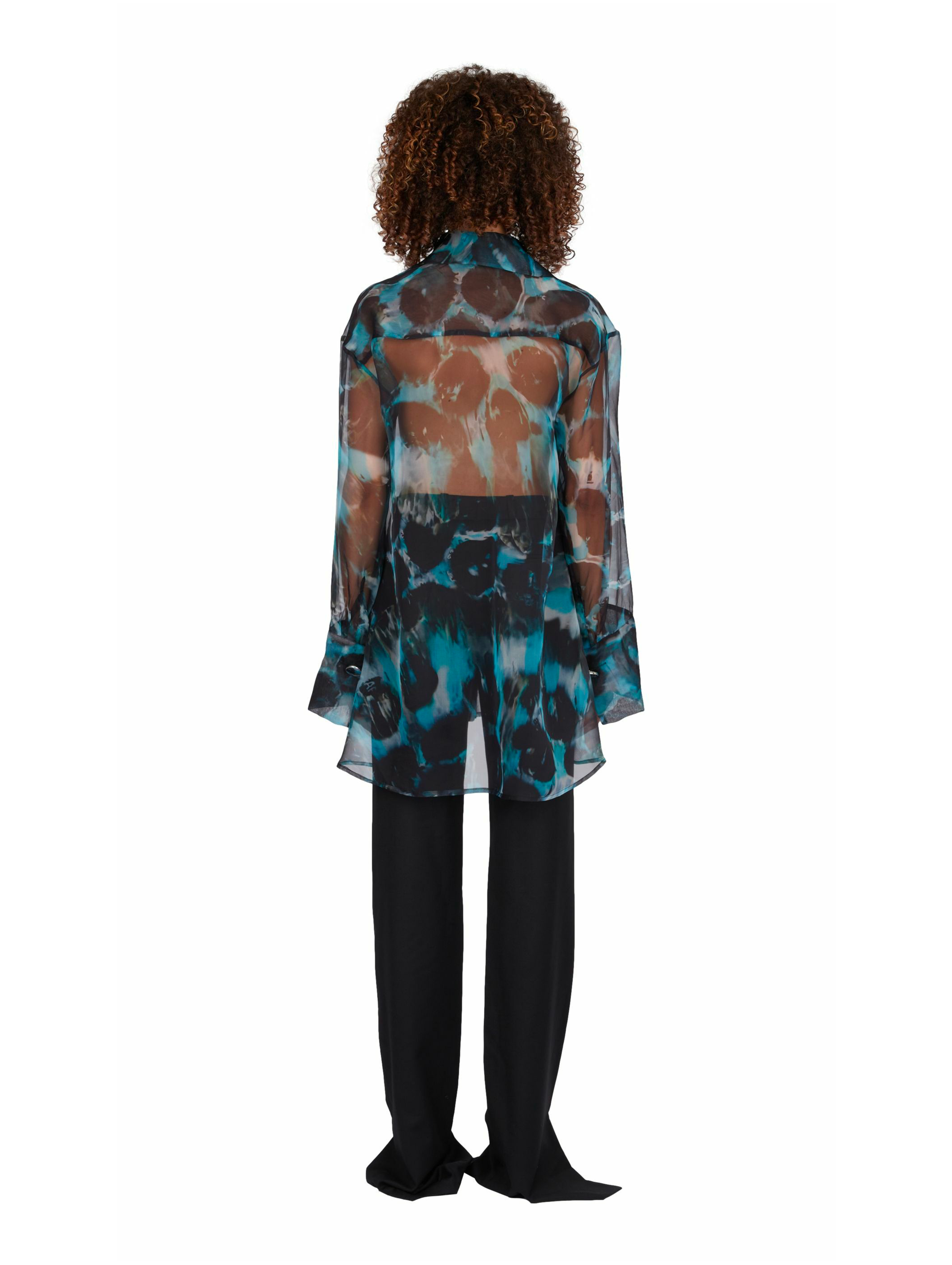 The sheer silk organza reveals a delicate play of transparency and light, giving the piece a refined sensuality. Its boyfriend-inspired shape with dropped shoulders and elongated cuffs brings a relaxed, effortless attitude a balance between casual ease and sophisticated elegance.